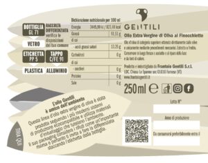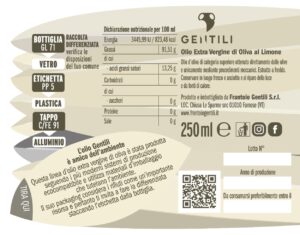 Tra i più difficili traguardi nella produzione degli aromatizzati Gentili c’è sicuramente l’olio EVO al limone. Dopo anni di tentativi, fatti con prodotti diversi (diverse tipologie di limone) Romolo pare abbia trovato la quadra con un fruttivendolo locale che gli ha proposto un prodotto più che adatto per il matrimonio con il suo olio. Acidulo e deciso il gusto del limone non si abbina così facilmente con l’olio, per questo Gentili ha iniziato un lungo lavoro di sperimentazione tra le sue cultivar che lo ha portato ad ottenere un prodotto fresco ed equilibrato adatto per molti generi di condimenti. I limoni provengono da un agrumeto di fiducia, la cui scorza entra nel processo di lavorazione delle olive fin dalla macerazione, per ottenere un olio EVO di qualità superiore che mantiene i giusti sentori di limone da apprezzare su piatti freschi, crudi di pesce, carpacci e battute di carne, insalate.
