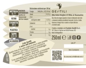 Pungente e delicato allo stesso tempo, l’olio al rosmarino è la più recente scommessa di Gentili. Un prodotto realizzato a filiera “cortissima”, la maestosa pianta di rosmarino nei terreni circostanti al frantoio offrono infatti una buona materia prima che accompagna la produzione di olio EVO fin da principio e non infusa, per ottenere un olio di qualità superiore, dall’inconfondibile aroma dato dalla spezia scelta. Partendo dall’Olio EVO Gentili, l’elemento centrale di questo aromatizzato è il rosmarino, le cui note decise vengono ammorbidite dalle varietà di oliva spremute per ottenere l’Extra Vergine che vanno ad impreziosire qualsiasi tipologia di carne e di pesce in alcuni casi. Sfizioso e stravagante, questo olio EVO di qualità superiore aromatizzato naturalmente al rosmarino tramite macerazione e gramolatura fatta insieme all’olio, donerà una spinta ad ogni piatto con un condimento deciso ma elegante.